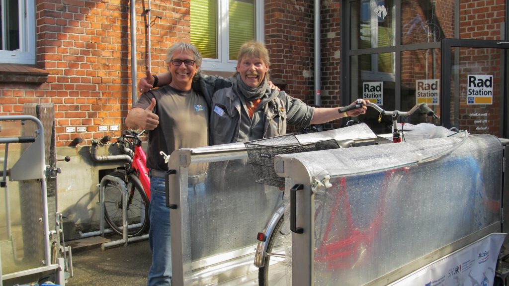 Eine Radtour kurz nach einem Regenguss, am Deich entlang oder über rustikale Feldwege: Das Fahrrad sieht anschließend nicht gerade reinlich aus und bedarf einer intensiven Säuberung. Solche Putzaktionen sind aber nicht nur zeitraubend; sie sind – ehrlicherweise – auch kein Quell reiner Freude. Doch die Radstation am Bahnhof, eine Einrichtung des Diakonischen Werks Husum (DW), bietet einen neuen Service an, mit dem das Fahrrad im Nu wieder „wie geleckt“ aussieht: Es handelt sich dabei um die einer länglich-flachen Kabine ähnelnde Fahrrad-Waschanlage. Über eine kleine Rampe wird das Rad auf einer Schiene in diese Kabine geschoben, die mit einer besonders robusten Kunststofffolie geschlossen wird. Zwei weiche Bürsten, ähnlich wie in einer Autowaschanlage, bringen das Fahrrad schonend auf Hochglanz. Dieser Vorgang dauert nur wenige Minuten. Anschließend wird das Rad trocken gerieben und ist sogleich wieder fahrbereit.