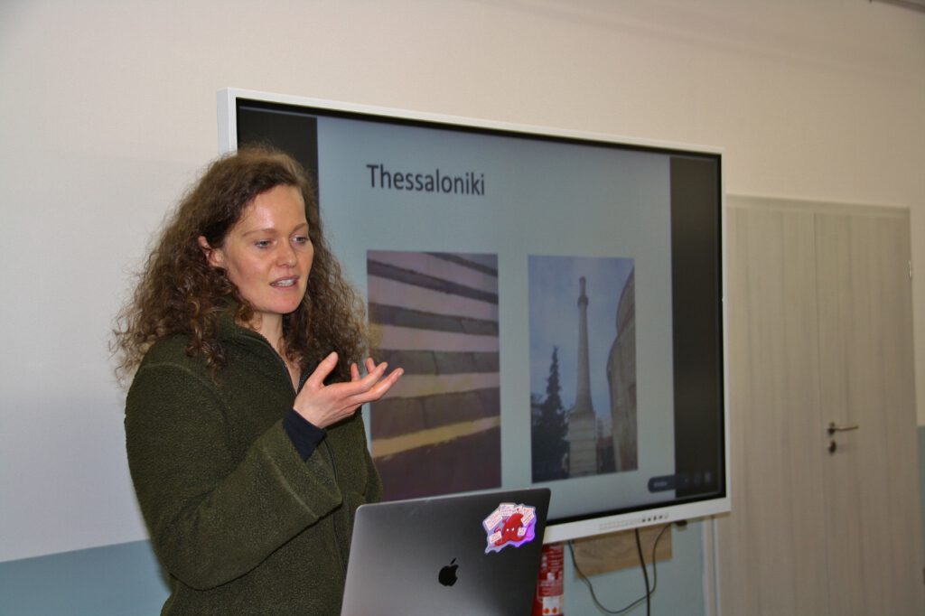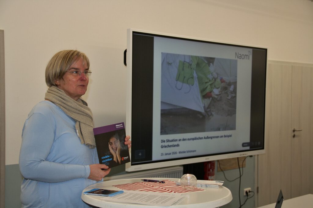 Über die Verhältnisse im Lager Diavata weiß Wiebke Schümann gut Bescheid: Sie hat dort vor einiger Zeit ein Jahr – schwerpunktmäßig im Rückzugsraum „Casa Base“ – gearbeitet. Sie untermauerte die Fotoausstellung mit zum Teil eigenen Fotos und mit eindrücklichen Zahlen: So sind mittlerweile über 30.500 Personen auf ihrer Flucht im Mittelmeer ertrunken – hier verläuft die „gefährlichste Außengrenze“ der EU. „Im Lager gibt es nur gelegentlich eine rudimentäre medizinische Versorgung, keinen rechtlichen Beistand, und statt Geld gibt es Sachleistungen. Theoretisch lautet die Forderung, dass ein Lager nicht wie ein Gefängnis aussehen darf, dass unter anderem Kinder niemals Zeugen von Gewaltszenen werden sollen; die Wirklichkeit sieht jedoch anders aus“, so Wiebke Schümann. Ihre Wirkungsstätte im Lager Diavata war „NAOMI“, eine ökumenische Organisation in Thessaloniki für Geflüchtete, die sich unter anderem für Notfallhilfe, Beratung, Bildung und soziale Teilhabe engagiert und auch eine Textilwerkstatt im „Casa Base“ unterhält. „Die Fotoausstellung zeigt unter anderem den Mut, die Stärke und die psychische Widerstandskraft der Frauen und Kinder, die bereits so viel durchgemacht haben“, betonte Wiebke Schümann. Oftmals werde von den Medien und der Politik Angst geschürt; doch viel wichtiger sei es, Hoffnung und Zuversicht zu befeuern.