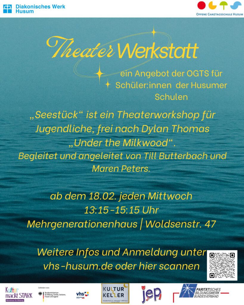 Das Theaterprojekt findet in Kooperation mit der Volkshochschule Husum und der Stadtbibliothek statt und wird mit dem Projektpartner JEP (Paritätisches Bildungswerk Bundesverband) durchgeführt und über „Kultur macht stark“ finanziert. Informationen und Anmeldungen sind unter der Telefon-Nummer der Familienbildungsstätte 04841-2153 möglich.
