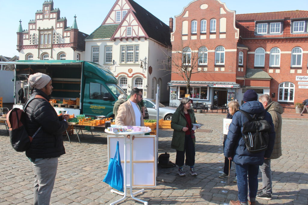 Auch in Husum war die Fachstelle Migration auf dem Wochenmarkt am 19. März mit einem Stand vertreten: