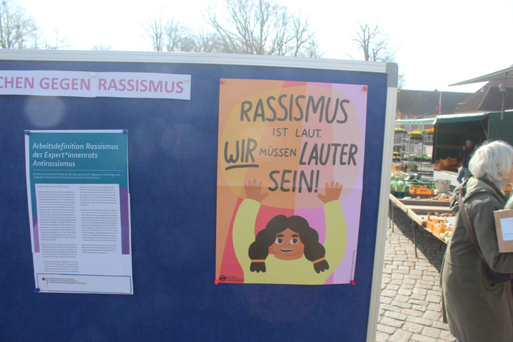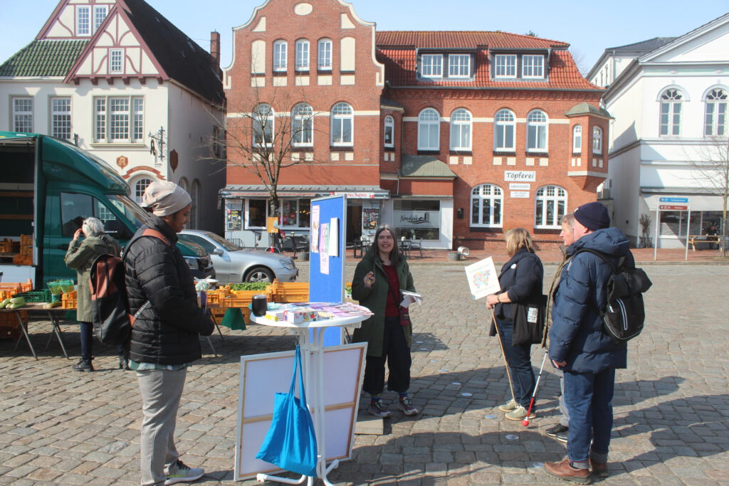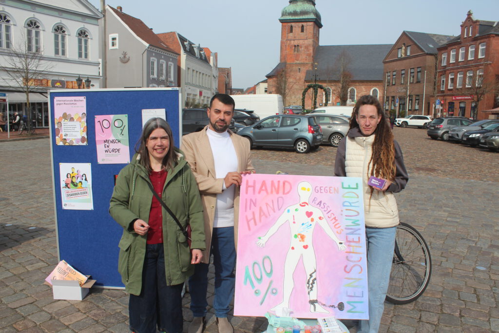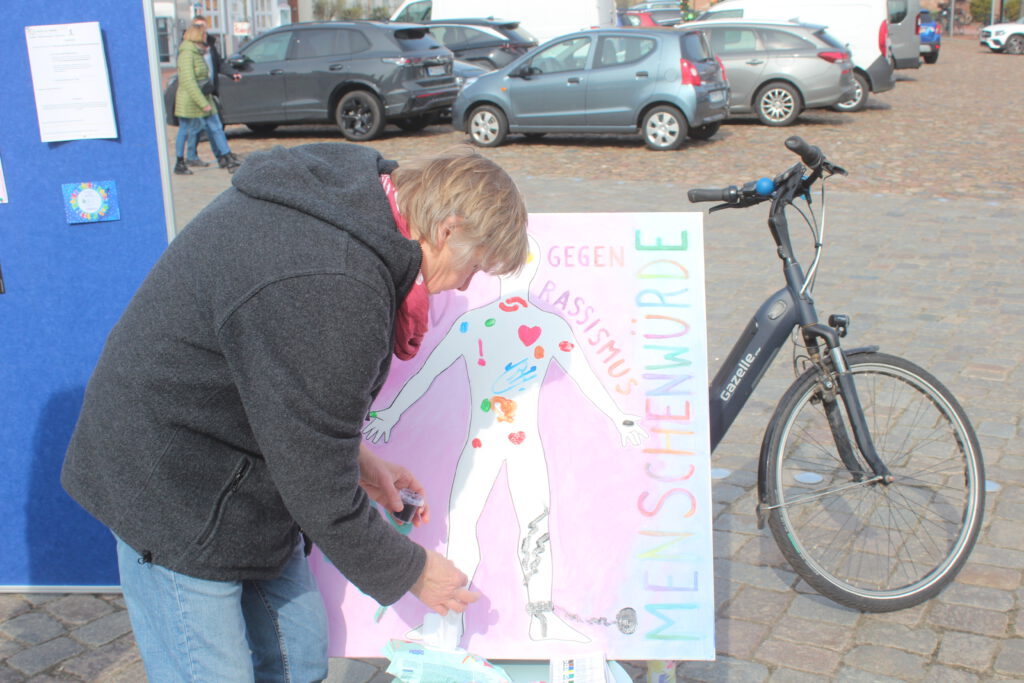 Auch die Diakonischen Werke in Schleswig-Holstein beteiligen sich mit verschiedenen Aktionen an den bundesweiten Veranstaltungen. So fand am 23. März vor der Kulisse des Tönninger Wochenmarkts eine Kunstaktion des Diakonischen Werks Husum (DW) statt. Die von der DW Fachstelle Migration Husum & Umland und Eiderstedt organisierte Veranstaltung wurde von den Vereinigungen „Buntes Eiderstedt“ und „Pro Asyl“ unterstützt. Als Mitarbeitende der Fachstelle verteilten Synje Detlefsen und Alaa Ahmad Handzettel an Passanten, auf denen die verschiedenen „Gesichter“ und die alltäglichen Vorkommnisse sowie die Auswirkungen von Rassismus dargestellt sind. „Leben und leben lassen ist ein guter Vorsatz, um miteinander klarzukommenden“, kommentierte eine Passantin das Geschehen. Zudem wurde zur freiwilligen Teilnahme an einer Malaktion aufgefordert. „Wir haben es uns zur Aufgabe gemacht, auf das Thema Rassismus aufmerksam zu machen und möchten darüber mit den Menschen vor Ort gerne ins Gespräch kommen“, betonte die Abteilungsleiterin des DW Cordula Wulfert.