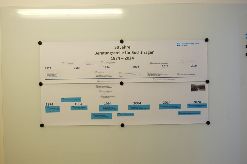 Unsere Beratungsstelle für Suchtfragen ist ein gutes Beispiel dafür, wie lange schon aktive Hilfe für Menschen in allen Lebenslagen im Diakonischen Werk Husum angeboten wird. Ein halbes Jahrhundert lang beraten, begleiten und helfen die Mitarbeitenden der Beratungsstelle zum Thema Sucht. Bis vor einem Jahr befanden sich die Büros noch in der Theodor-Storm-Straße 7 in Husum – im November 2023 erfolgte der Umzug in die neuen Räumlichkeiten des Alten Pastorats an der Friedenskirche Husum.