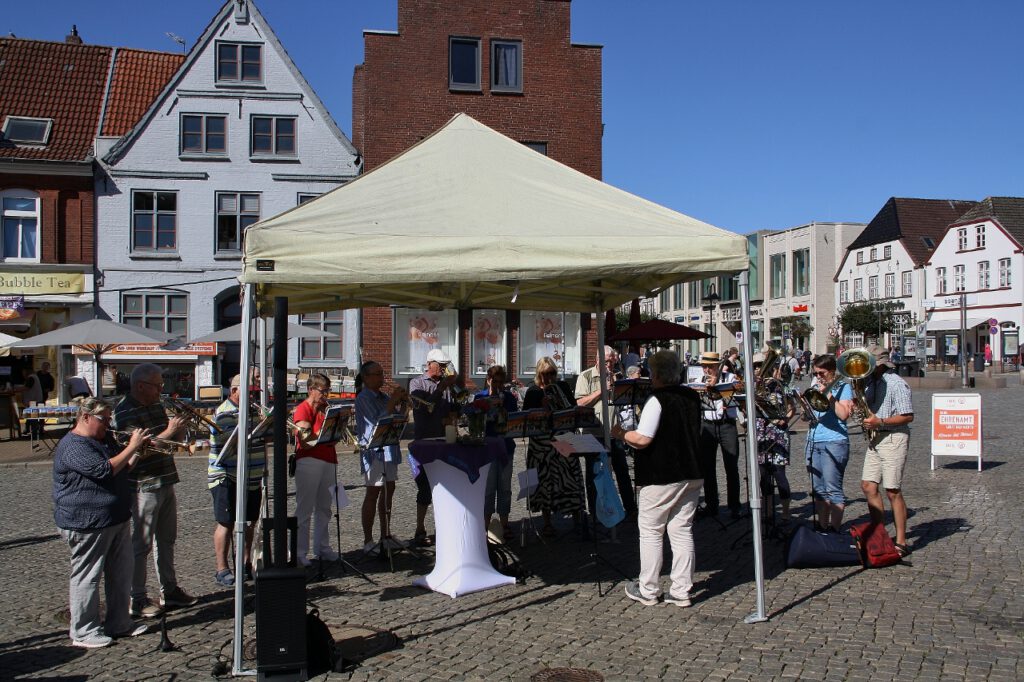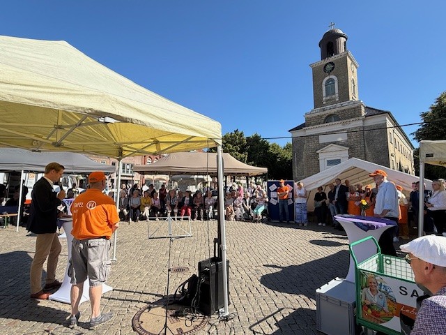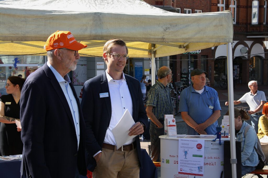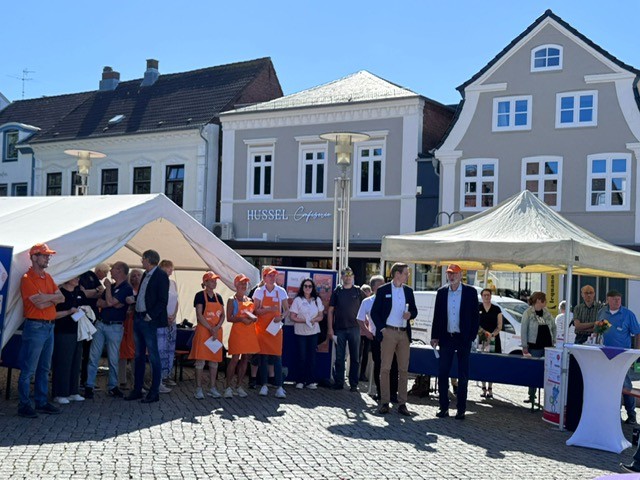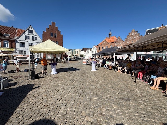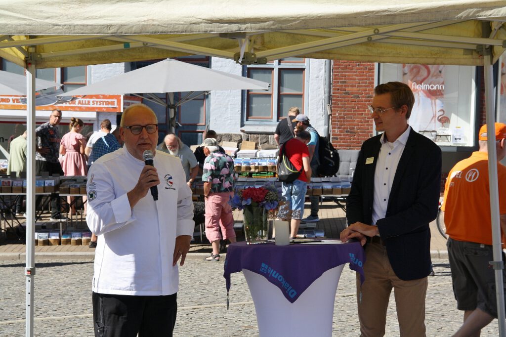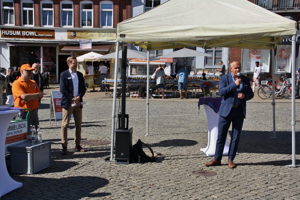 Eine besondere Anerkennung erhielten – auch von Bürgermeister Martin Kindl – die Ehrenamtlichen, ohne die „nix läuft“, die eine wichtige Stütze der Gesellschaft bilden und die zum Wohle aller Bürger ihre Kraft, Zeit und Liebe investieren. Er dankte allen, die sich für diese Veranstaltung „ins Geschirr“ gelegt hatten. Doch könne, so Kindl, die ehrenamtliche Arbeit nur funktionieren, wenn sie von Herzen komme – so wie bei der langen Tafel, an der das Tafel-Team um Charly Häuber tatkräftig mitgewirkt hatte. Dieser lieferte ein paar eindrückliche Zahlen: „Pro Woche versorgen wir in Husum rund 350 Haushalte mit mehr als 700 Personen. Dazu kommt die mobile Tafel mit ihren Stopps in verschiedenen Landgemeinden. Sie steht für etwa 70 Haushalte mit rund 180 Personen parat. Bei beiden Tafeln arbeiten rund 100 Ehrenamtliche.“ Damit es bei den Tafeln immer „läuft“, damit nie personelle Engpässe entstehen und die Arbeit stets eine Freude und Bereicherung ist, werden weitere ehrenamtliche Mitarbeitende gesucht – als Fahrer oder Fahrerin, in der Sortierung oder letztendlich in der Ausgabe. Wer sich im Team einbringen möchte, kann sich bei der Tafel melden. Weitere Informationen gibt es unter Husum – Tafeln des Diakonischen Werkes Husum.