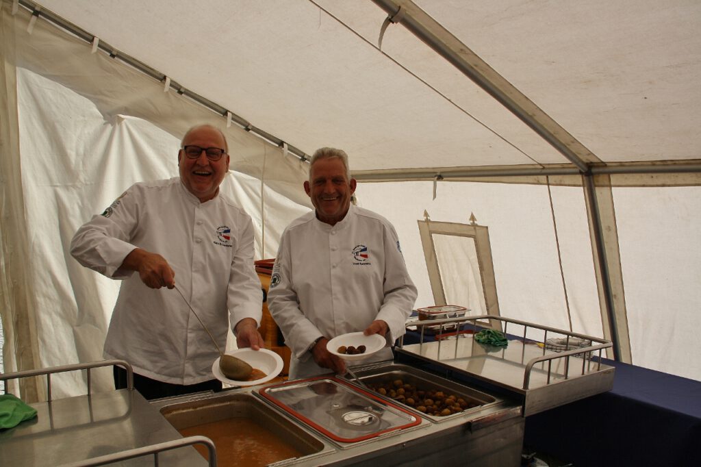 Die Kirchengemeinde Husum und das Diakonische Werk Husum bilden gewissermaßen eine Symbiose: „Sie gehören eng zusammen“, wie Pastor Andreas Raabe zu Beginn seiner Andacht anlässlich der diesjährigen „Langen Tafel“ sagte. Deshalb ist der Marktplatz zu Füßen der ehrwürdigen Marienkirche, auf dem die Veranstaltung einmal im Jahr stattfindet, der beste Platz in der Stadt, um die Menschen zusammenkommen zu lassen. „Gott hat uns den Tisch gedeckt, hier wird gekocht, gelacht und gelöffelt“, umriss es der Pastor, dessen Worte umrahmt wurden vom Husumer Posaunenchor. In einer komplizierten, lauten und hektischen Zeit werde alles leichter, wenn nicht nur der Duft einer guten Suppe durch die Luft ziehe, sondern wenn in Gemeinschaft Geschichte geteilt und Freude weitergegeben werden könne. Dabei duftete die Suppe nicht nur, sondern schmeckte auch hervorragend: „Ackerbohnencremesuppe mit Gemüseeinlage und Topping“. Verantwortlich für diesen kulinarischen Genuss zeichnete traditionell Klaus Carstensen vom Verein der Köche Westküste und gleichzeitig Mensa-Chef vom Paulsen-Gymnasium in Niebüll. Unterstützt wurde er von seinem Mitarbeiter Uwe Karstens.