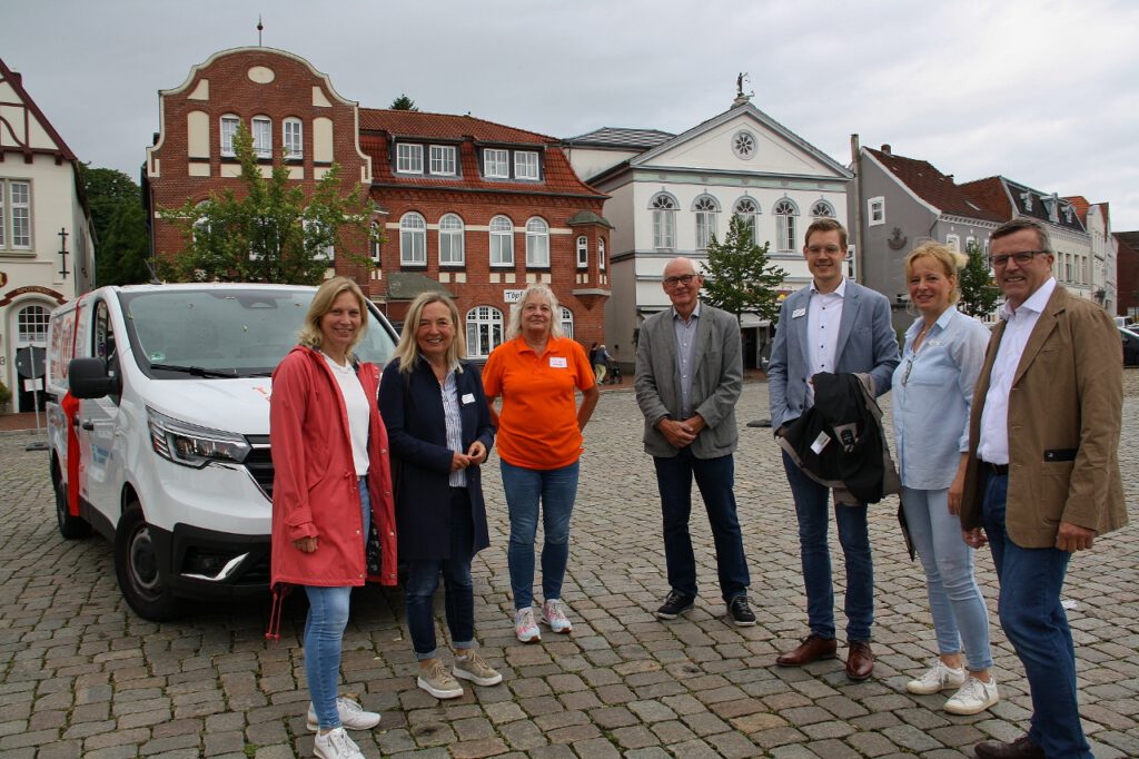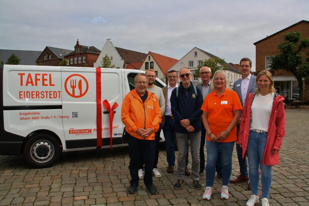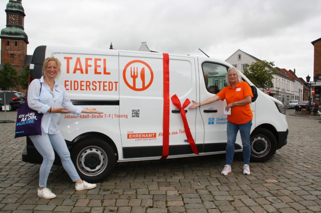 Dorothe Klömmer dankte dem Tafel-Team und allen Unterstützenden für die pragmatische und wirksame Hilfe, auch und ganz besonders jenen, die sich an der Finanzierung des neuen Kühlfahrzeugs, das bei dieser Gelegenheit offiziell seiner Bestimmung übergeben wurde, beteiligt hatten. Auch die Stadt Tönning habe sich gern mit einer Finanzspritze angeschlossen, sagte die Bürgermeisterin. „Gelebte Solidarität“ – so nannte DW-Geschäftsführer Jens Grehm die Arbeit der Tafel: Herz und gemeinsamer Wille seien notwendig, um an einem Strang zu ziehen. Er dankte allen Unterstützenden, Sponsoren und Sponsorinnen für ihr Engagement. „Ohne Ihr Vertrauen wäre unsere Arbeit nicht möglich“, betonte er im Beisein von DW-Bereichsleiterin Adelheit Marcinczyk, die sich den Danksagungen anschloss. Ina Hinrichsen, die die Tafel Eiderstedt leitet, ist stolz auf ihr Team aus 18 Ehrenamtlichen, das wöchentlich bis zu 120 Menschen versorgt. Sie zollte auch den Mitarbeitenden des Tönninger Bauhofs großes Lob, die spontan beim Aufbau der Zelte mitgeholfen hatte.