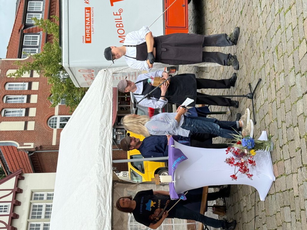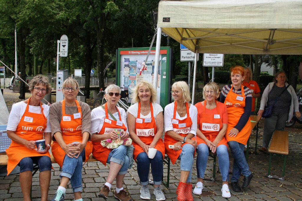 Die „Lange Tafel“ wurde musikalisch angenehm und unaufdringlich umrahmt vom Violinisten Kristofer Vio. Die Getränke wurden von REWE kostenfrei zur Verfügung gestellt. Das Kühlfahrzeug wurde gesponsert von: C&D Ölservice GmbH, Evangelische Bank Stiftung, Elka Torantriebe Tönning, Hessling Stiftung, Innerwheel, Kurt Jans GmbH Tönning, Lions Clubs Goesharde, Husum und Husum Uthlande, Rotary Clubs Eiderstedt und Husum e.V., Stadt Tönning, Sternhagen’sche Familienstiftung, Tafel Deutschland/Lidl Pfand-Stiftung, Unylecta GmbH, VR-Bank Westküste, Fiete Dehn privat und Hintze Haustechnik. Die Tafel bietet Menschen, die ehrenamtlich arbeiten möchten, ein breites Spektrum an Tätigkeiten in einem freundlichen, zugewandten Team. Hier finden alle gemäß ihren Neigungen eine erfüllende Aufgabe. Wer sich für die Arbeit in der Tafel Eiderstedt interessiert, kann sich mit der Tafel-Leiterin Ina Hinrichsen gern in Verbindung setzen.