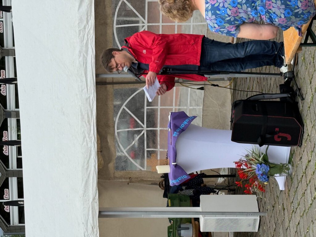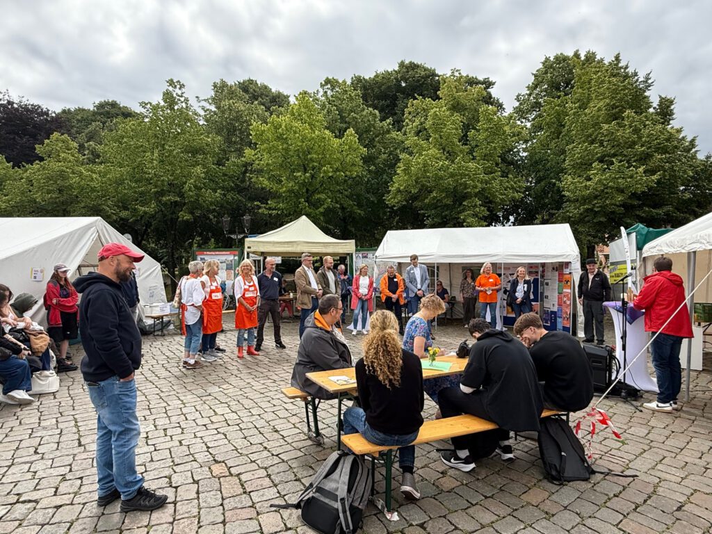 „Wir brauchen mehr sommerliche Leichtigkeit angesichts von Kriegen, Krisen und Klimakatastrophe“, forderte der Pastor der Kirchengemeinde Tönning-Kating-Kotzenbüll, Alexander Böhm in seiner erfrischenden Andacht zum Auftakt der diesjährigen „Langen Tafel“ in Tönning. Die Veranstaltung ließ Leichtigkeit und gute Stimmung keineswegs vermissen: Zum dritten Mal hatte die Tafel Eiderstedt, eine Einrichtung des Diakonischen Werks Husum (DW), den Tönninger Marktplatz in eine Stätte der Begegnung „mit kulinarischem Höhepunkt“ umgewandelt. Der Aufsichtsratsvorsitzende des DW, Prof. Dr. Stefan Krüger, brachte es auf den Punkt: „Die Tafel setzt mit dieser Veranstaltung ein kraftvolles Zeichen, verbindend in einer Zeit, da mehr und mehr das Trennende wichtig wird“, sagte er. Es sei ein Anliegen der Tafel, solche Räume zu schaffen, wo Würde und Nächstenliebe walten. Die „Lange Tafel“ sei nach den Worten von Tönnings Bürgermeisterin Dorothe Klömmer „ein Symbol für gelebte Gemeinschaft, für Solidarität und freundliches Miteinander: Spontan, ungezwungen und immer verbindend.“