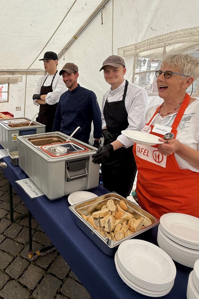 Doch alle Anwesenden hatten sich schon längst auf einen guten Teller Suppe gefreut: Die Küche des Jugendaufbauwerks Dithmarschen hatte sich wieder ins Zeug gelegt und Chili con Carne – sowie eine vegetarische Variante dieses beliebten Gerichts – in Wärmebehältern mitgebracht. „Ich finde es wichtig, dass es solche Begegnungen, wie hier auf dem Marktplatz in Tönning, gibt“, sagte Koch-Ausbilder Thomas Dölitzsch. „Mein Mitstreiter Stephan Matschulla und ich freuen uns, dass wir wieder für Sie kochen durften.“ Dölitzsch kam nicht allein: Er hatte zwei seiner Auszubildenden, Benedikt Brinckmann und Kevin Schulmeister, mitgebracht, die gern ihre Freizeit für diese Veranstaltung geopfert hatten.
