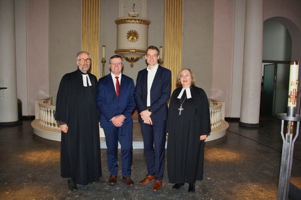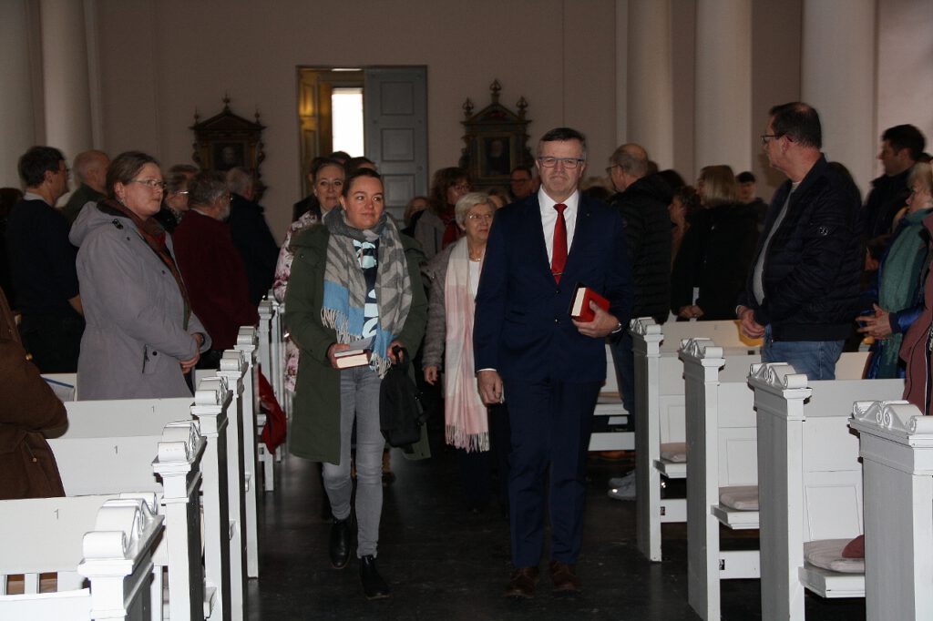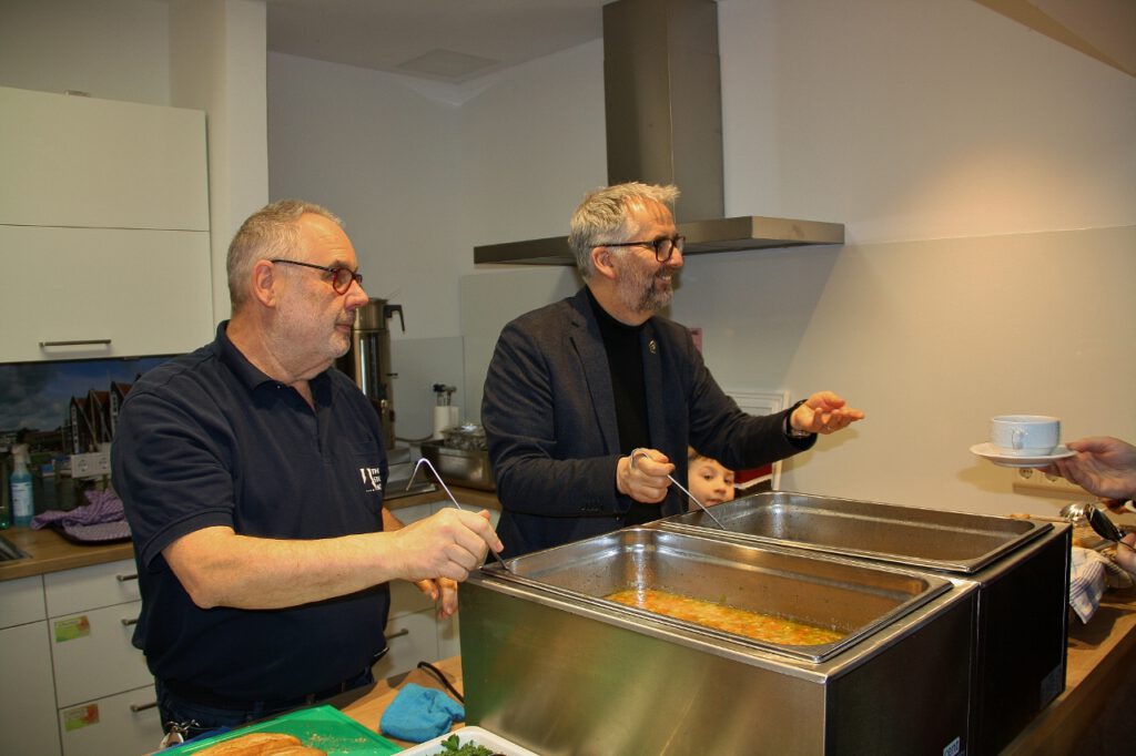 Nach der kirchlichen Zeremonie gab es noch ein wenig geselliges Beisammensein im Gemeindehaus: Hier war genug Gelegenheit, Kontakte und Gedankenaustausch bei einer schmackhaften Gemüsesuppe zu pflegen. Auch für einige kurze, aber kraftvolle und richtungsweisende Grußworte war Zeit: „Der Wechsel von Volker Schümann auf Jens Grehm war ein wichtiger Meilenstein in der Geschichte des Diakonischen Werks Husum“, sagte der Aufsichtsrats-Vorsitzende, Professor Dr. Stefan Krüger. Es gelte nun, die diakonische Arbeit weiterzuentwickeln mit Nächstenliebe und Einsatz für die Menschen in der Region. „Dies bedeutet Fachwissen, Empathie und Weitblick“, wobei Jens Grehm seine Expertise aus der Wirtschaft, sein Einfühlungsvermögen und sein Verständnis für die diakonische Arbeit in den letzten Monaten bereits eindrucksvoll unter Beweis gestellt habe. Er sei eine „starke und mutige Führungspersönlichkeit“, die Menschen in schwierigen Situationen begleite und sich gleichzeitig den Herausforderungen der neuen Zeit stelle. Volker Schümann, der befristet das Diakonische Werk Südtondern durch unruhige Zeiten lotst und den reibungsarmen Zusammenschluss der beiden Diakonischen Werke vorbereitet, dankte er „für ein gemeinsames Schaffen an einem starken Fundament der diakonischen Arbeit“. Dr. Krüger sagte dem neuen Geschäftsführer die volle Unterstützung des Aufsichtsrates zu und erinnerte daran, dass auch dessen eigene Familie einen wichtigen Stellenwert habe. Er wünschte Jens Grehm Erfolg, Kraft und Gottes Segen.