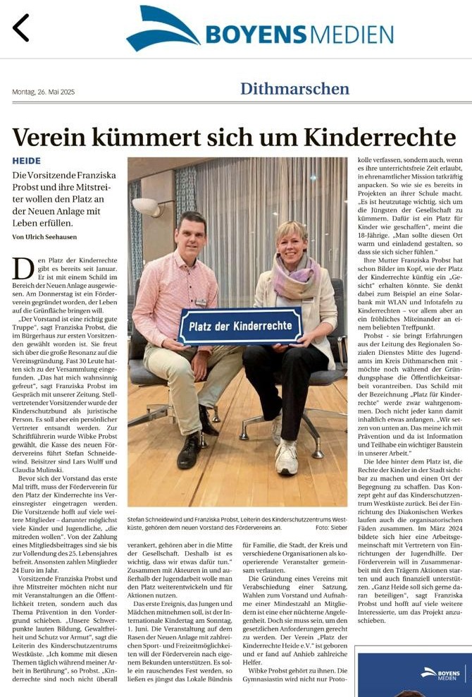 Platz der Kinderrechte – Verein kümmert sich um Kinderrechte26. Mai 2025 Artikel vom 26. Mai 2025 Dithmarscher Landeszeitung