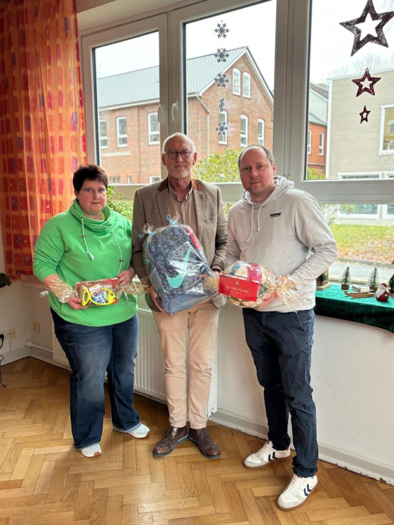 Meike Andresen (stellv. Einrichtungsleitung Brääklem Hüs), Michael Leschek (Einrichtungsleitung Brääklem Hüs) und Glenn Friedrichsen (Geschäftsführer Sporthaus Husum)