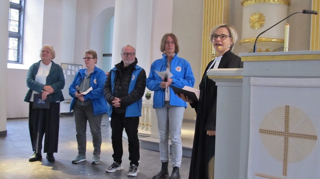 Leuchtend blaue Jacken mit der rückwärtigen Aufschrift „nächste Hilfe Bahnhofsmission“ sind das Markenzeichen aller Mitarbeitenden der rund 100 Bahnhofsmissionen in Deutschland. Und so kam es nicht von ungefähr, dass beim kürzlichen Gottesdienst in der Husumer Marienkirche anlässlich des Tags der Bahnhofsmission besonders viele blaue Jacken zu sehen waren: Getragen wurden sie von jenen  Frauen und Männern, die sich haupt- oder ehrenamtlich für Menschen einsetzen, denen – aus welchen Gründen auch immer – nicht viel mehr geblieben ist als buchstäblich „das letzte Hemd“. Bezeichnenderweise war es „Misericordias Domini“ (lat. „Barmherzigkeit des Herrn“, Anm. d. Autorin), der zweite Sonntag nach Ostern, der so genannte „Sonntag des Guten Hirten“, an dem mit einem Gottesdienst und einem anschließenden kleinen Fest die Aufgaben der Bahnhofsmission in den Fokus gerückt wurden. Ute Petersen, die seit einigen Jahren die im Diakonischen Werk Husum angesiedelte Bahnhofsmission leitet, machte mit beeindruckenden Zahlen deutlich, wie wichtig diese unbürokratische, zwischenmenschliche Arbeit ist: „In unserer Küche wurden im vergangenen Jahr 45.000 Mahlzeiten ausgegeben, fast 300 Mal haben Menschen bei uns übernachtet. Rund 11.000 Mal gab es Kontakte zwischen Auskunfts- und Ratsuchenden und den Mitarbeitenden der Bahnhofsmission, davon rund 8.000 Mal am Bahnsteig.“